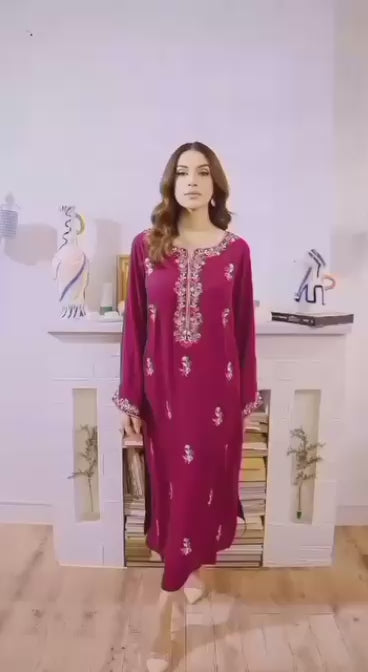 The kurta features delicate embroidered motifs scattered across the front, complemented by an intricately embroidered neckline and sleeve cuffs that add a refined, artisanal touch. Its straight silhouette and subtle side slits ensure a flattering fall, while the rich color enhances its sophisticated charm.
