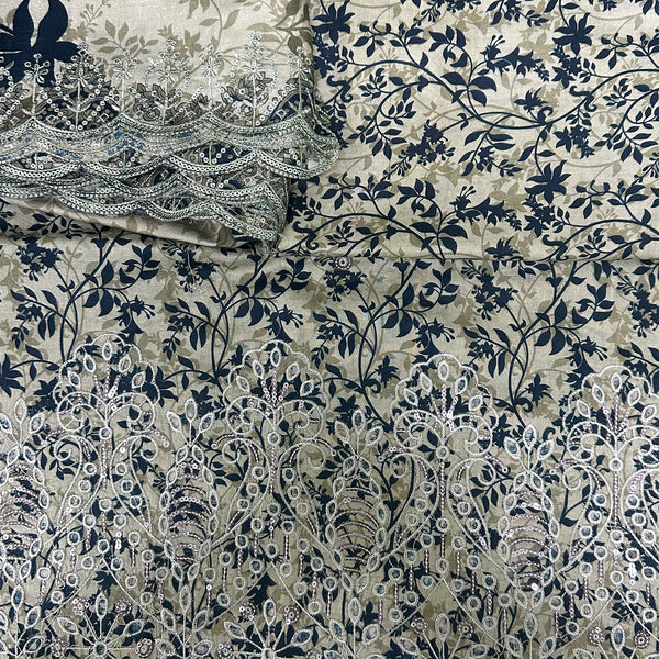 This elegant beige lawn suit is adorned with a graceful navy blue floral vine print, beautifully complemented by a heavily embroidered cutwork border. The intricate embroidery features delicate sequins and threadwork that add a refined, premium look to the outfit. Made from soft, breathable lawn fabric, this  suit is ideal for summer wear, casual gatherings, and semi-formal occasions, offering a perfect blend of comfort and sophistication.