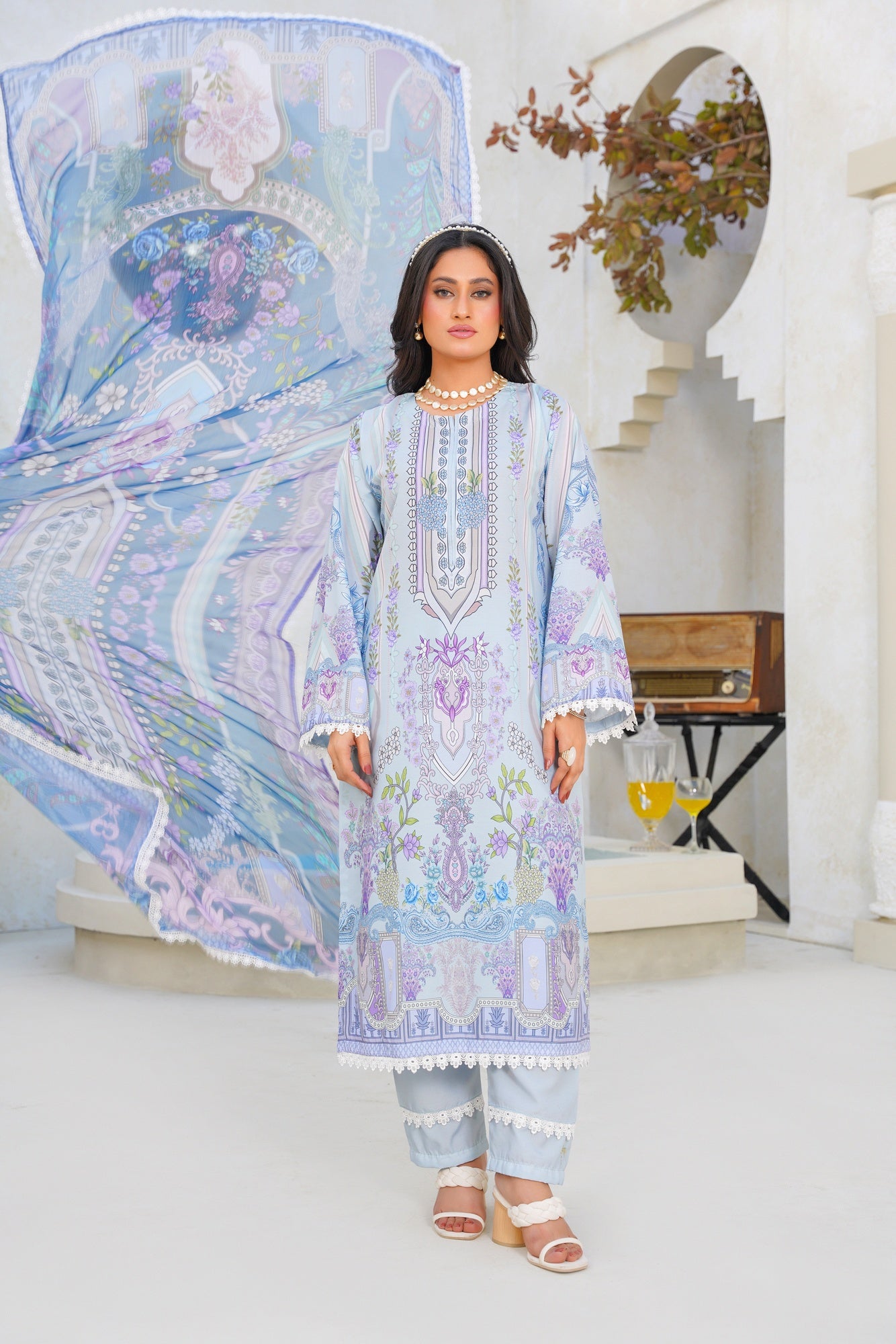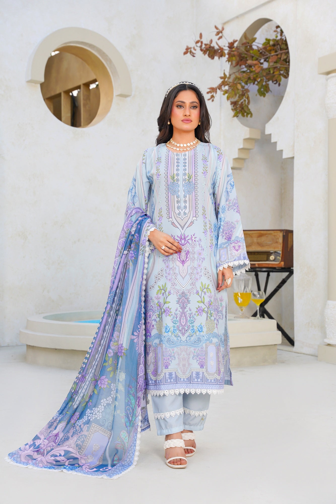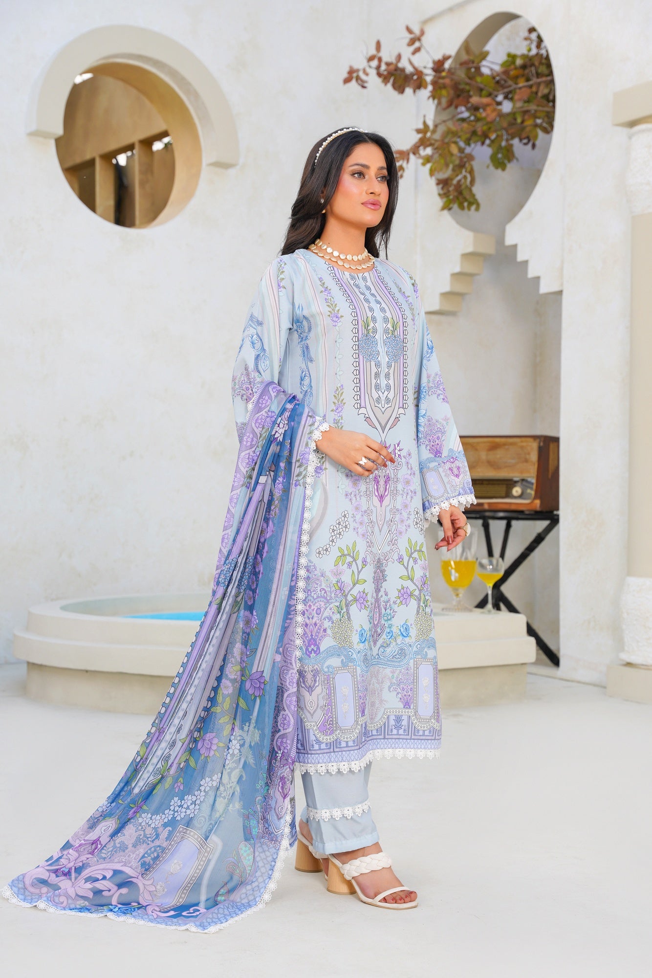 Step into ethereal elegance with Celestial Swiss — a beautifully crafted ensemble inspired by serenity, grace, and timeless sophistication. Designed in dreamy powder blue tones with delicate lilac florals, intricate ornamental prints, and refined detailing, this outfit captures a soft luxurious charm that feels effortlessly elegant.