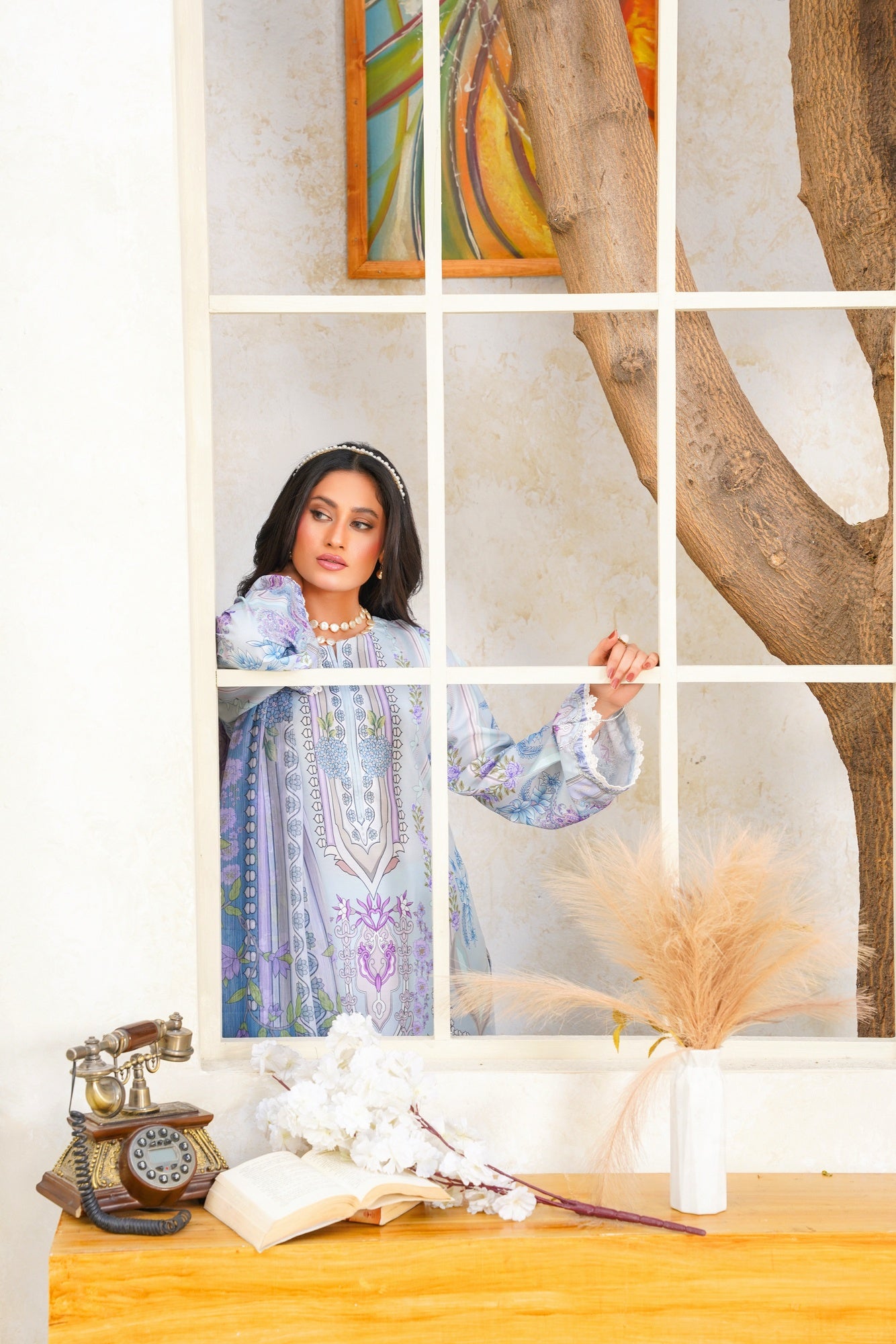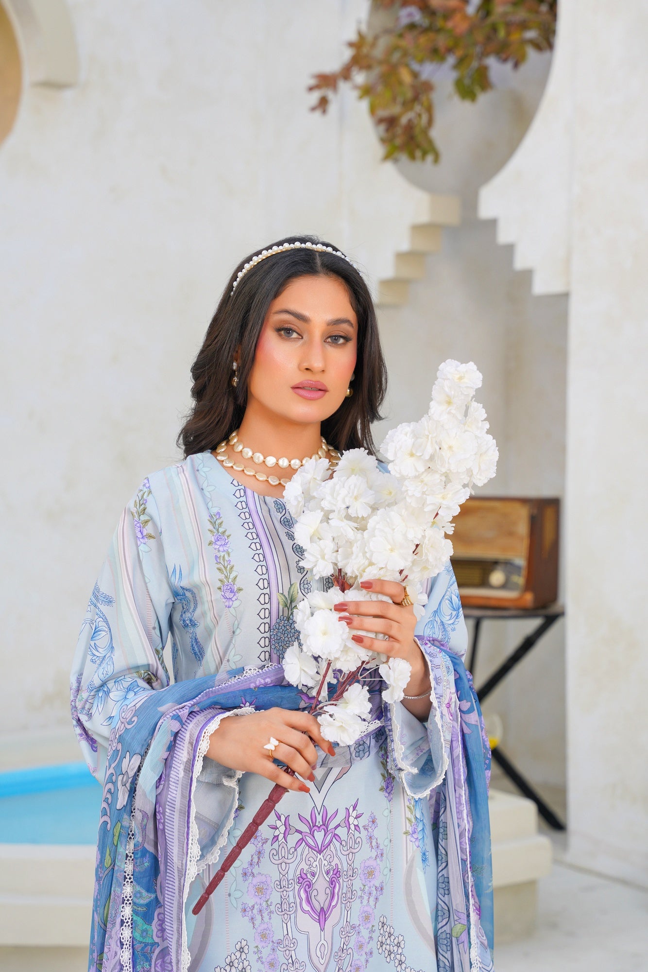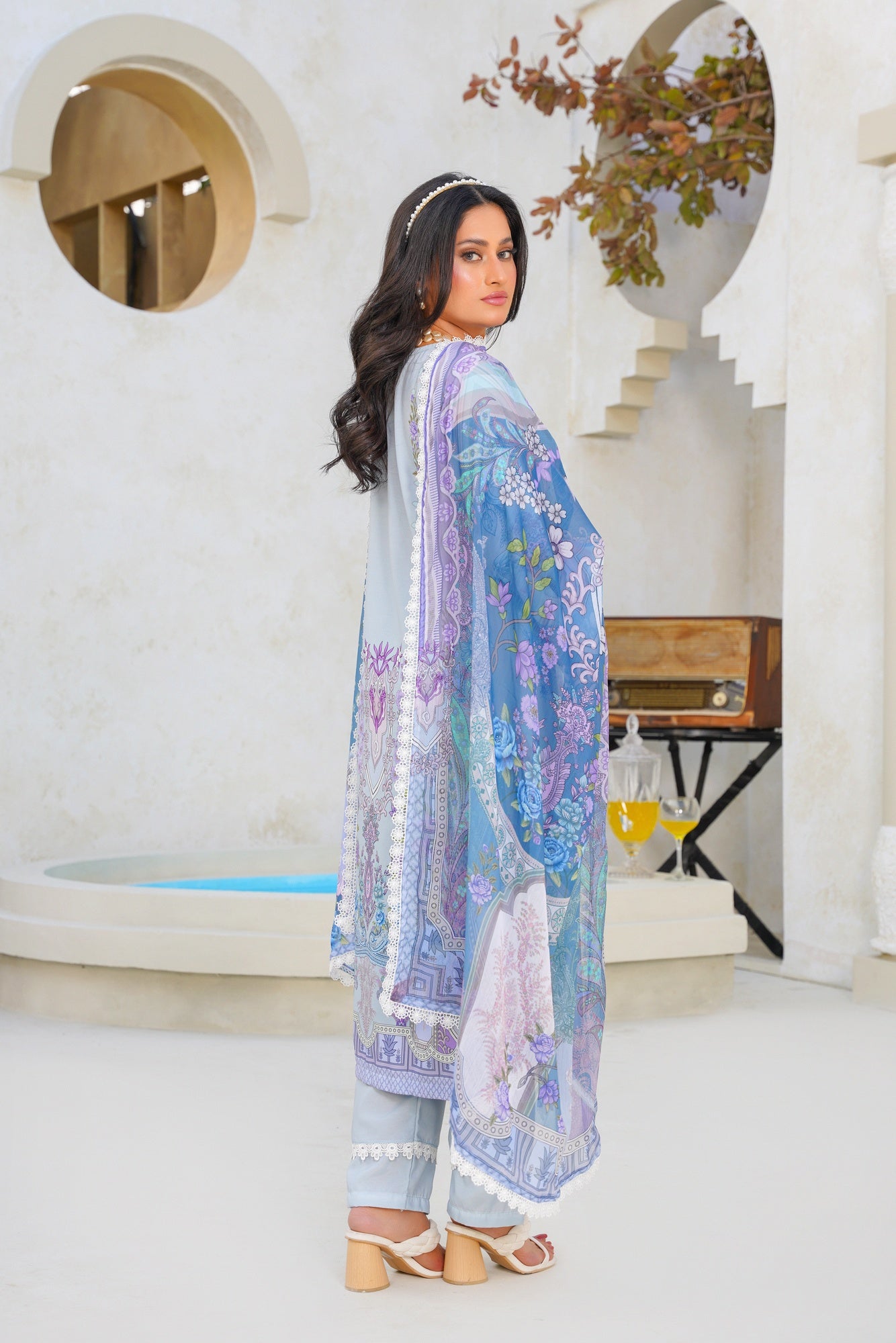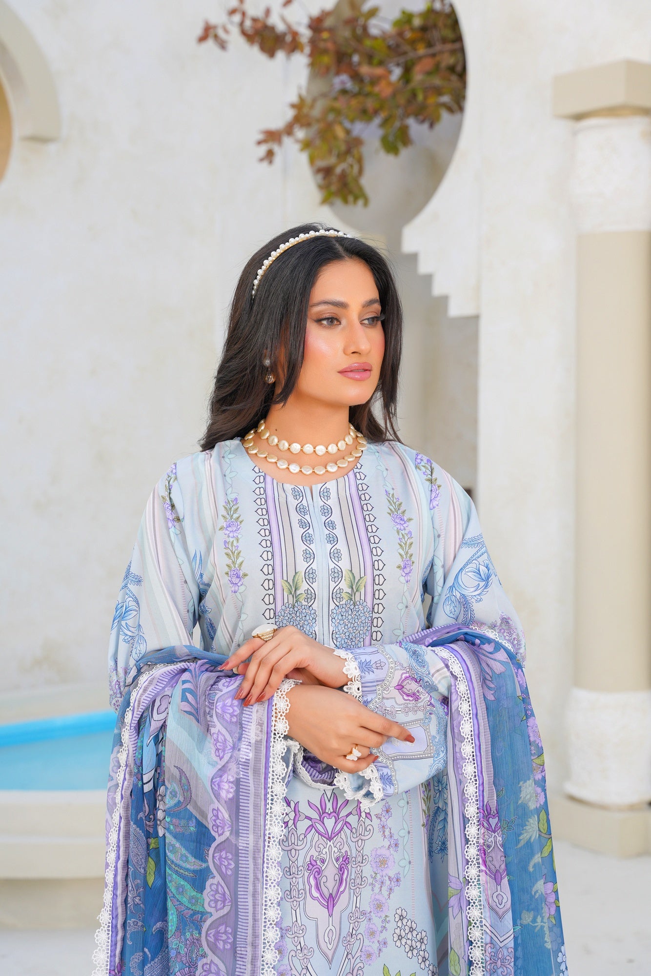 Step into ethereal elegance with Celestial Swiss — a beautifully crafted ensemble inspired by serenity, grace, and timeless sophistication. Designed in dreamy powder blue tones with delicate lilac florals, intricate ornamental prints, and refined detailing, this outfit captures a soft luxurious charm that feels effortlessly elegant.