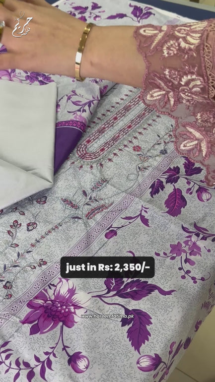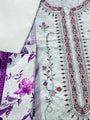 This soft fabric features intricate floral embroidery in deep reds and purples, complemented by subtle green accents. The delicate floral design flows beautifully along the neckline and borders, creating a refined and elegant look. The matching purple floral print fabric adds a vibrant contrast, making it perfect for creating traditional or semi-formal outfits. The combination of light tones and vibrant floral accents gives this fabric a timeless, sophisticated appeal.