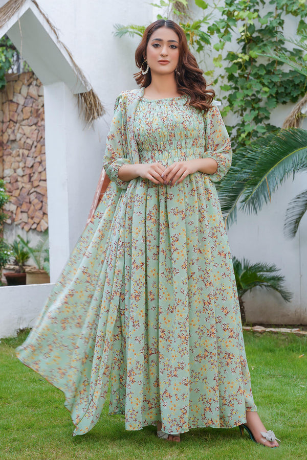 This sky green chiffon maxi is adorned with a delicate all-over pink flower print and features elegant frill detailing on the upper part. Paired with a matching dupatta, it’s perfect for a fresh and feminine style.
