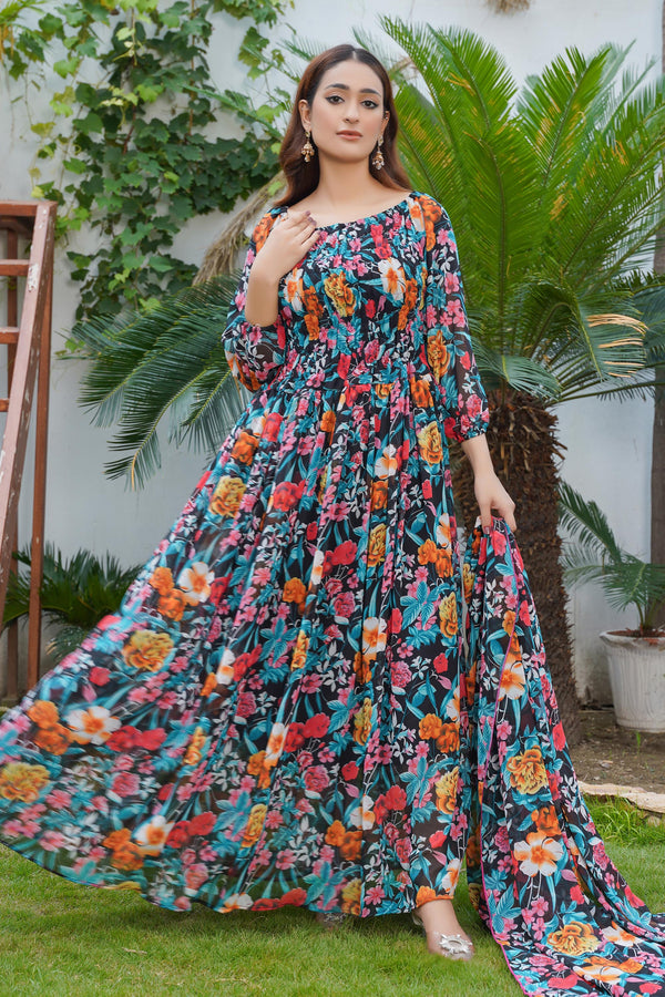Elevate your style with this chic black chiffon maxi, adorned with a vibrant multi-color floral print. The upper frill adds a touch of elegance, perfectly complemented by the matching dupatta. Ideal for any special occasion.