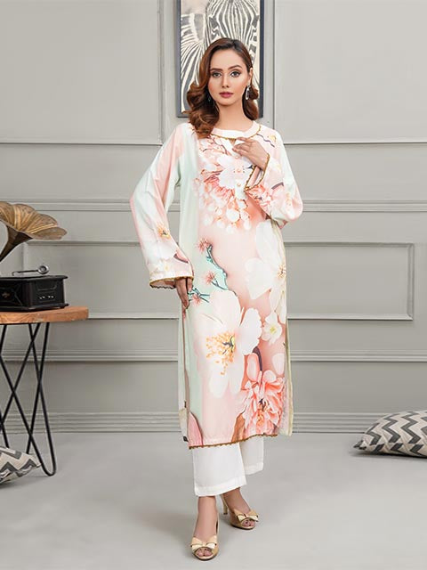 Embrace the essence of spring with this delightful two-piece set crafted from luxurious Swiss lawn. The soft pista base showcases charming pinkish peach stripes, beautifully complemented by a delicate white and pink flower patch on the front. The back features matching stripes for a cohesive look, while the stylish round neck adds a touch of sophistication. Paired with plain pista trousers, this ensemble is a perfect blend of freshness and elegance, making it ideal for any occasion!