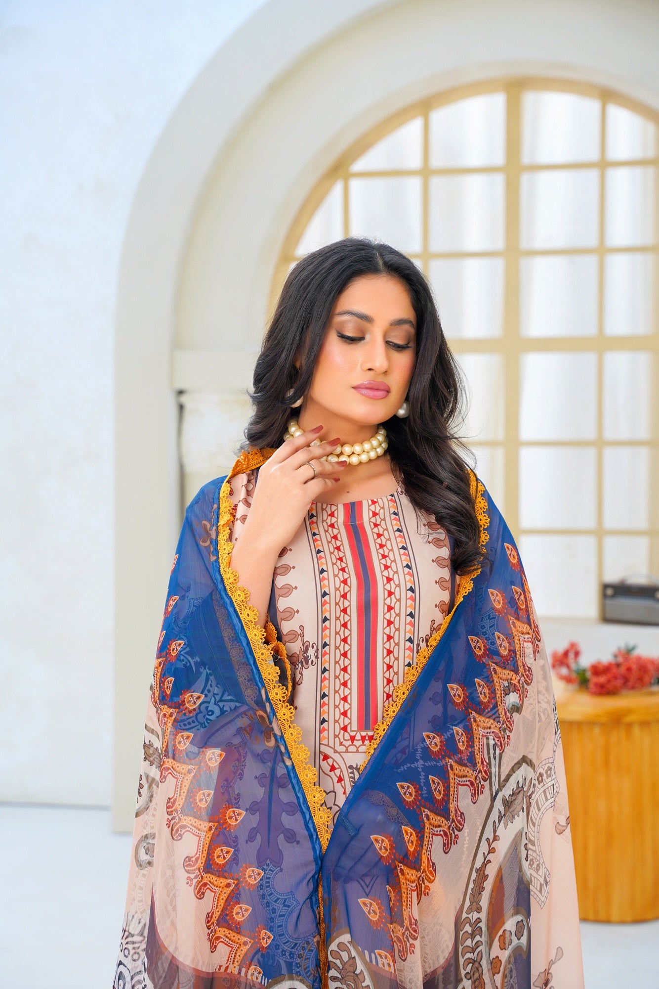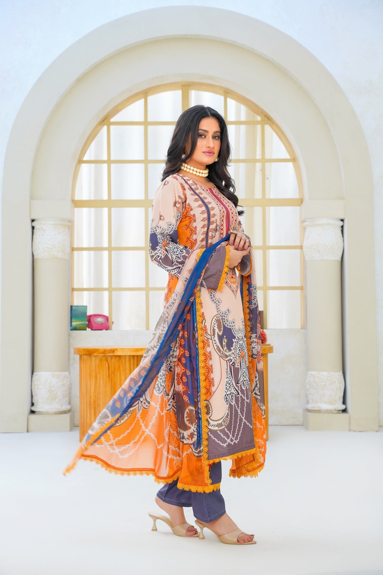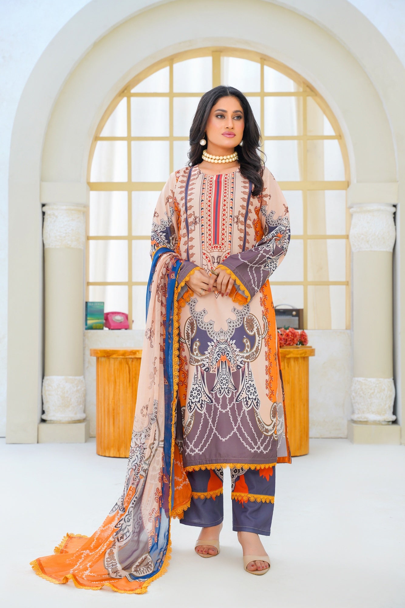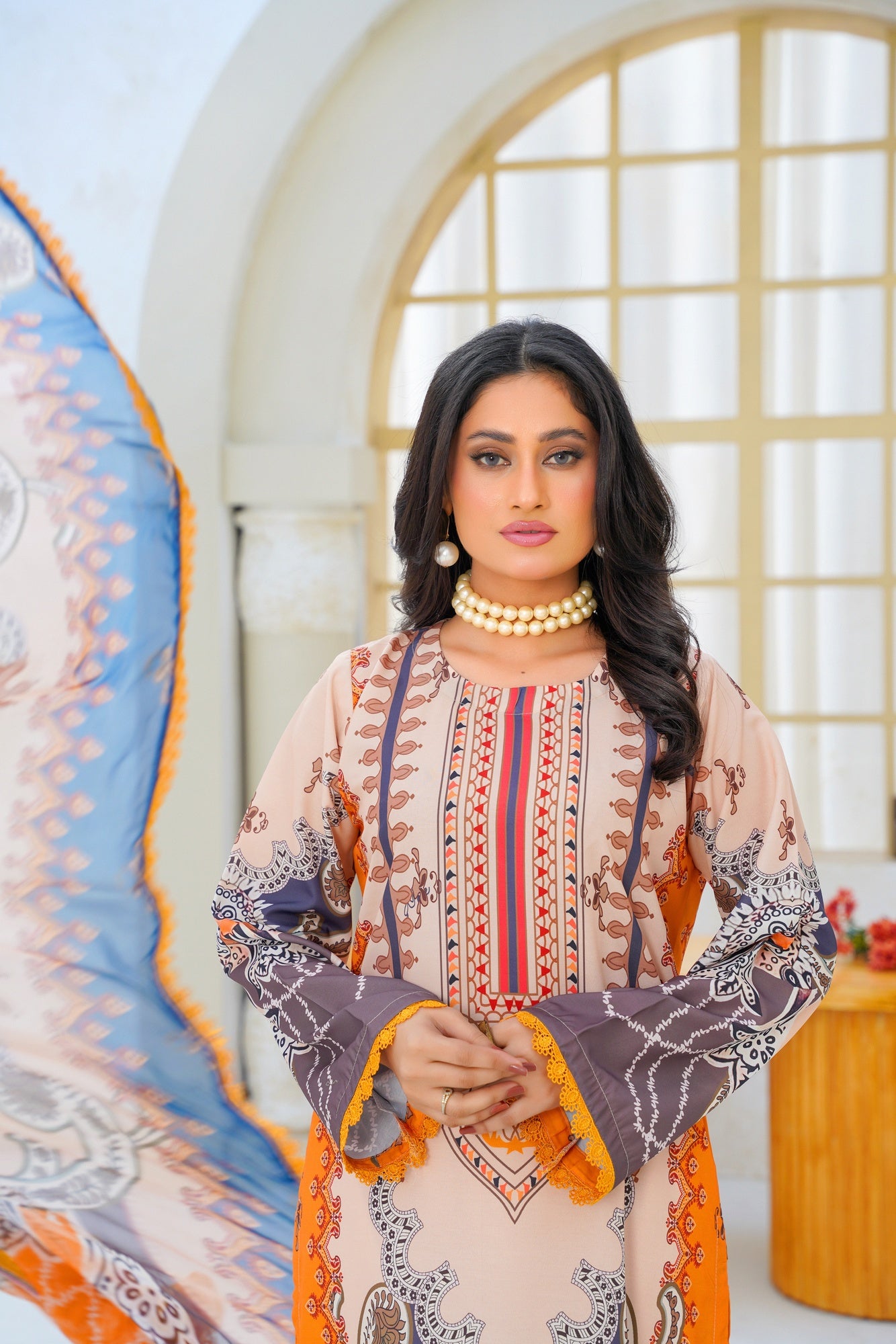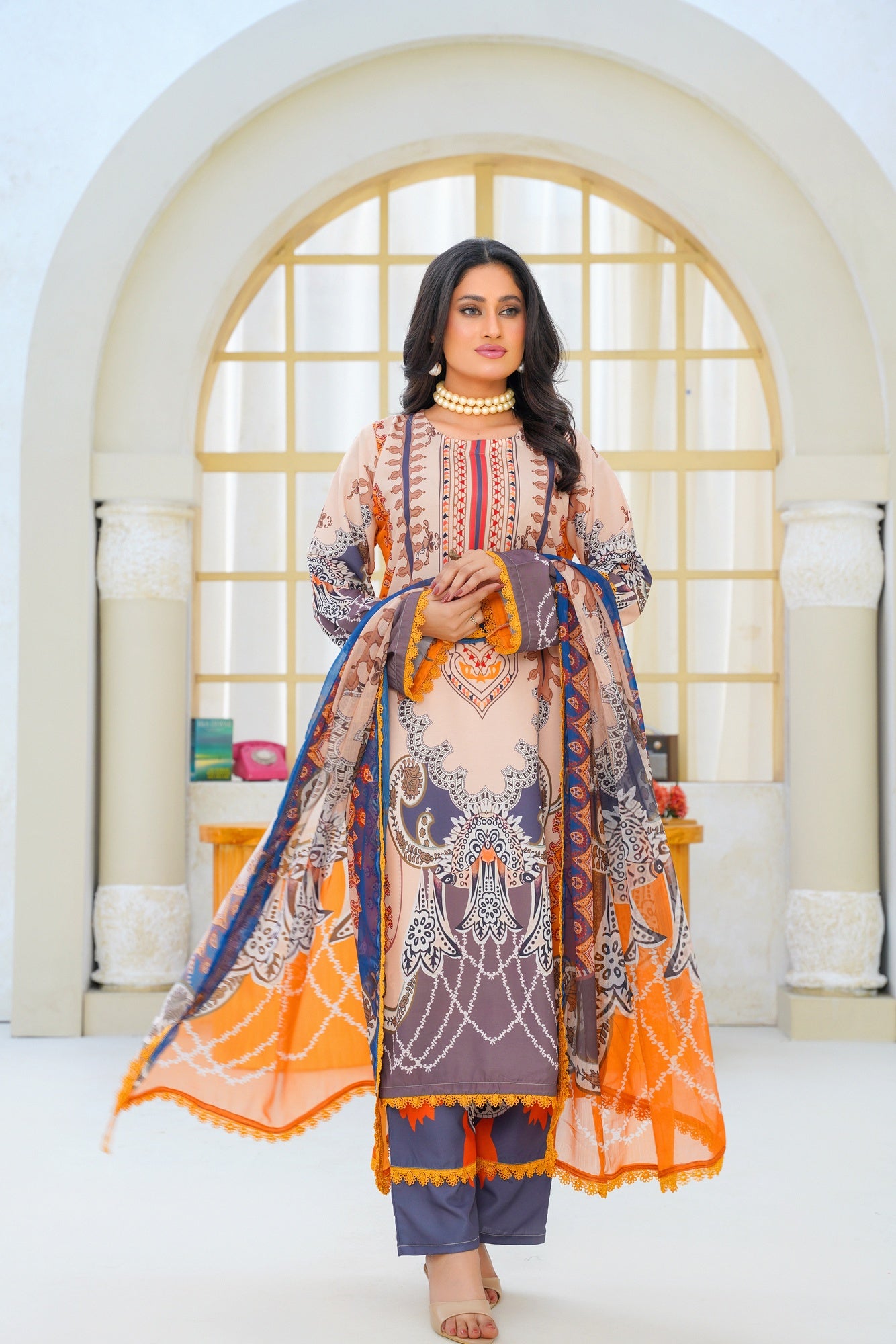Paired with a digitally printed chiffon dupatta, the ensemble adds a touch of luxury and effortless flow. The lightweight chiffon drapes beautifully, enhancing the overall silhouette with grace and sophistication. Perfect for casual day wear, festive gatherings, and semi-formal occasions, this outfit blends contemporary design with classic charm.